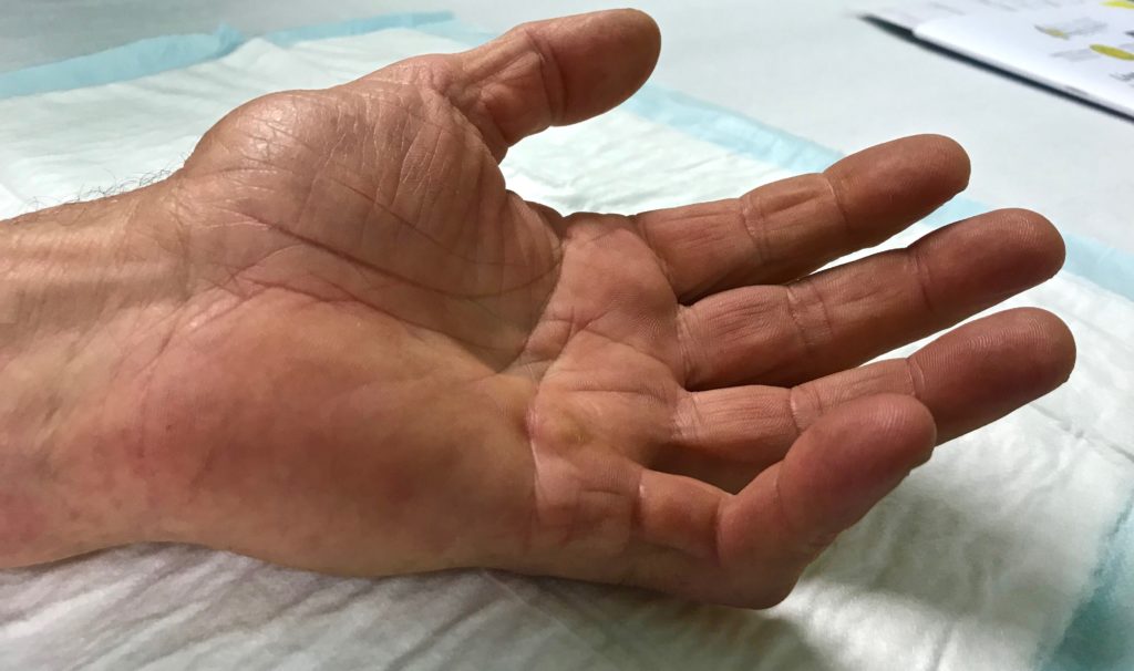 – L’ablation des brides (Aponévrectomie): Les incisions mettent environ trois semaines pour être bien cicatrisées et seront épaisses pendant plusieurs mois. Dans certains cas, le chirurgien peut laisser ouvert une partie de la cicatrice pour éviter des complications comme les hématomes ou la souffrance de la peau. La cicatrisation sera alors un peu plus longue mais souvent un peu moins douloureuse. Une rééducation et le port d’une attelle pour étendre les doigts sont très souvent nécessaires. La dissection de la maladie au contact des vaisseaux et des nerfs est difficile; les nerfs sont parfois irrités ce qui entraînent des sensations de fourmillements dans les doigts qui peuvent parfois persister plusieurs mois. La section d’un nerf ou d’une artère est également possible. Enfin les doigts peuvent rester raides, surtout le cinquième doigt.